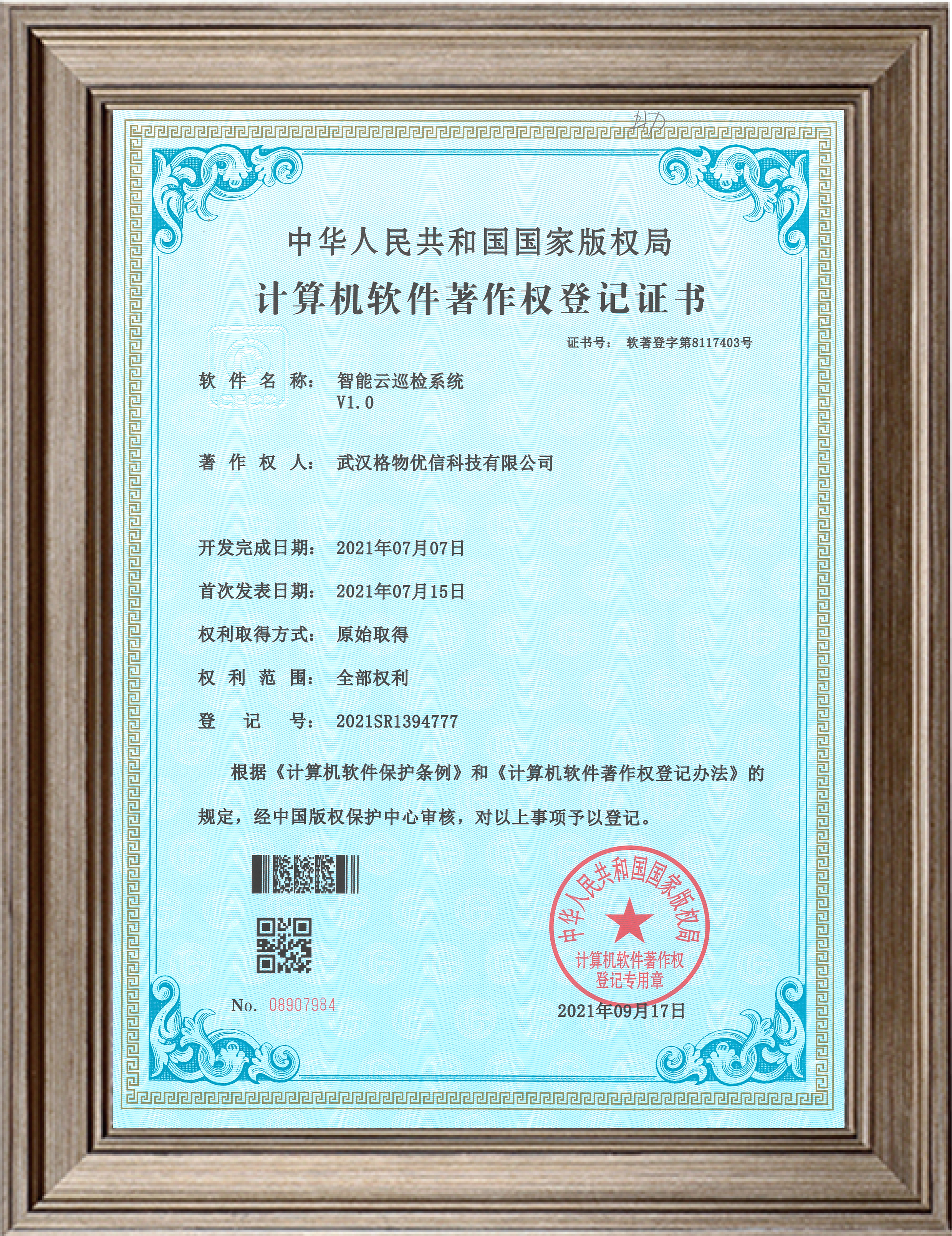 2016.8 自主研发“无人机机载热像仪软件”“格物优信X系列热像仪前端软件”获国家版权局“计算机软件著作权登记证书”