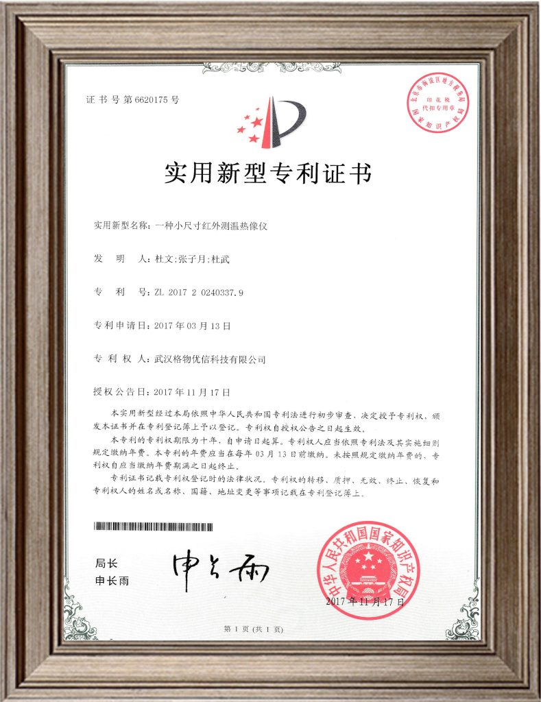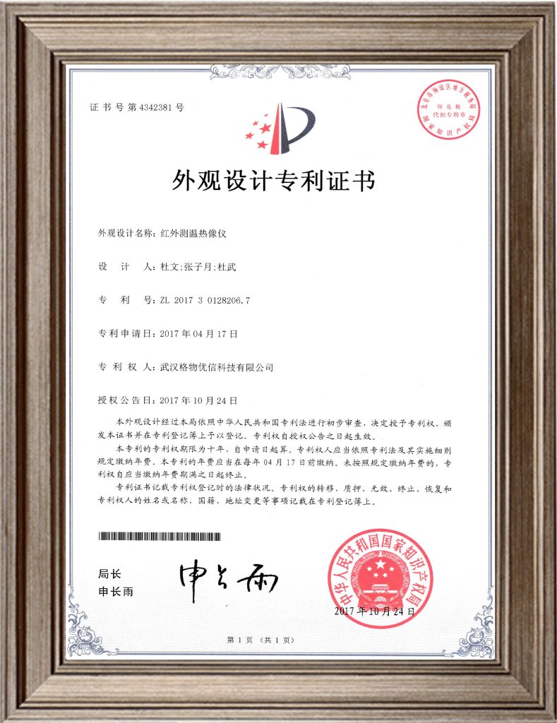 2017.11 自主研发“一种小尺寸红外测温热像仪”,获国家知识产权局“外观设计专利证书”