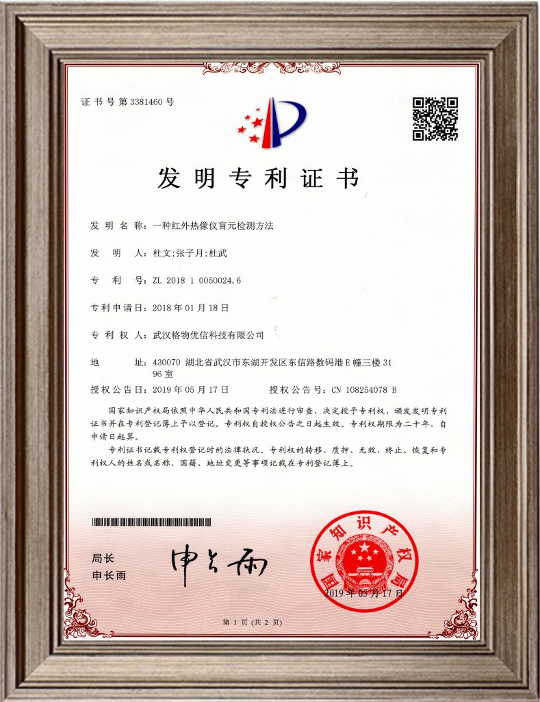 2018.1 自主研发“一种红外热像仪盲元检测方法”,获国家知识产权局发明专利证书