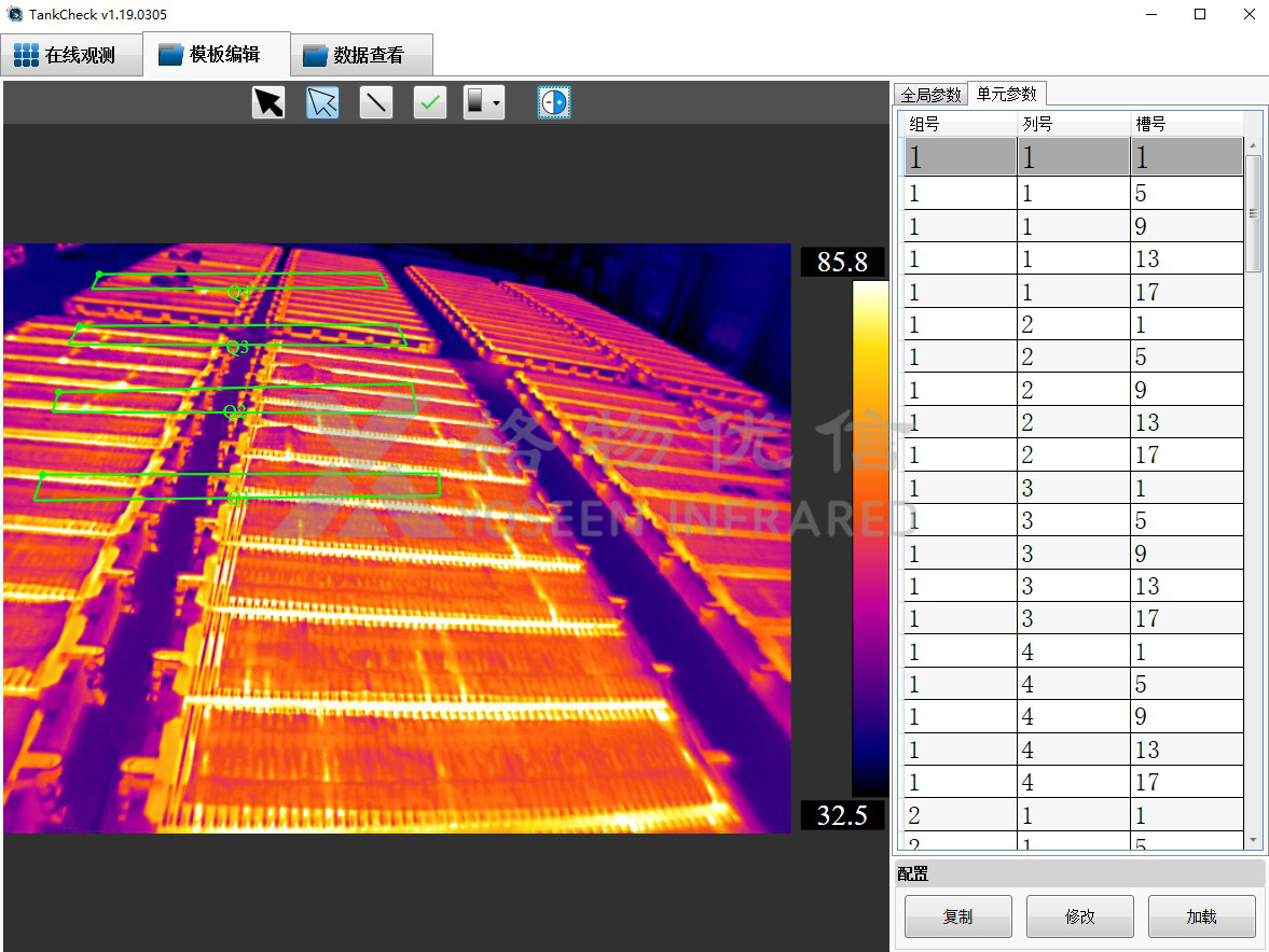 格物优信通过热成像设备和配套的电解槽专用控制软件,通过机器视觉方式,高效率地完成对厂区所有单槽的检查、准确定位出短路极板位置并通知工厂检修更换,提高了运行效率。基于红外热像仪的电解槽在线监测系统,通过检测极板温度来判断极板间的短路具体位置,利用热像仪采集电解槽的红外热图像,由计算机对红外热图像进行处理以获得温度异常的像素点,通过后台分析软件进行分析处理,定位实际故障电极即温度过高点的位置,从而找到实际检测区域极板短路故障位置进行故障解决,还可以通过软件设置及连接报警器实现温度过高实时报警。监测过程由系统自动控制完成,相较于传统的人工检测而言,具有高效性、及时性,降低了人力和能耗成本。